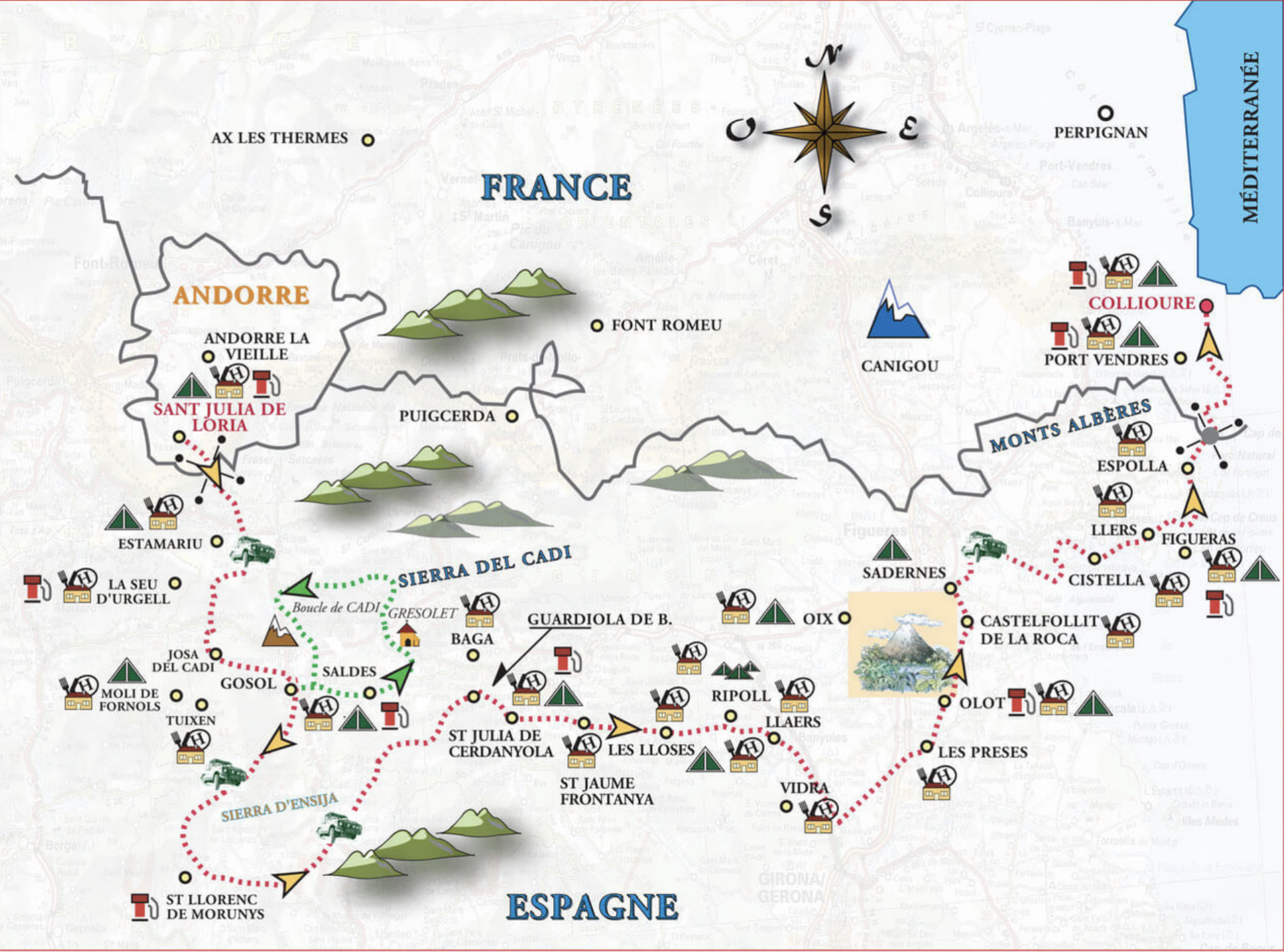 Ce road book ne manque pas de contraste et de variété. La première partie se fait sur des pistes de montagnes. Vous emprunterez les chemins des contrebandiers qui transitaient entre l’Espagne et l’Andorre. Vous explorerez aussi les pentes de la belle sierra de Cadi. S’ensuivront les zones boisées de la Garrotxa, poumon vert et volcanique de la Catalogne. Enfin l’atmosphère se fera plus méditerranéenne à l’approche de la Costa Brava. Pistes sèches et poussiéreuses sous les pins, avant d’atteindre la plaine de Figueras. Vous roulerez dans un dédale de pistes bordées de joncs, quelques passages à gué, avec en toile de fond un dernier massif à franchir. Vous rejoindrez la frontière par les belles pistes bordées de mimosas du Parc Naturel des Albères.