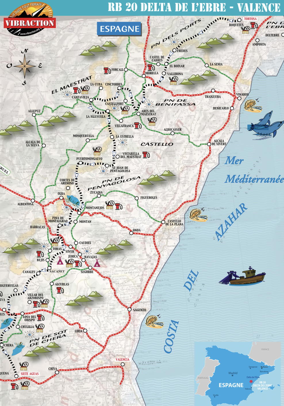 Ce vingtième road book nous montre une nouvelle fois que pour découvrir intimement la nature d’une région, la randonnée tout terrain est un moyen idéal. À l’opposé de nombreux pays européens, l’Espagne nous montre une fois encore que cela reste possible. Et lorsque l’on a ressentie cette sensation de voyager librement au travers d’une nature que la civilisation envahissante n’a pas encore atteinte, on sait qu’il nous sera difficile de nous en passer. Voilà pourquoi il est nécessaire de rester attentif à nos comportements sur ces pistes qui pourraient vite ressembler à des terrains de jeux pour certains amateurs de pilotage. Or si nous voulons conserver ce privilège, il est primordial de rester discrets et de ne s’y rendre qu’en petits groupes. Également important d’aider les petits commerces ruraux où nous passons en approvisionnant nos pique-niques chez eux. Comme toujours, nous espérons et croyons que notre souci sera le vôtre et que votre ligne de conduite restera guidée par cette citation: «ne laisse pas ta trace là où les siècles se sont abstenus de le faire…» Ainsi poursuivrons nous encore longtemps nos découvertes… nous l’espérons.