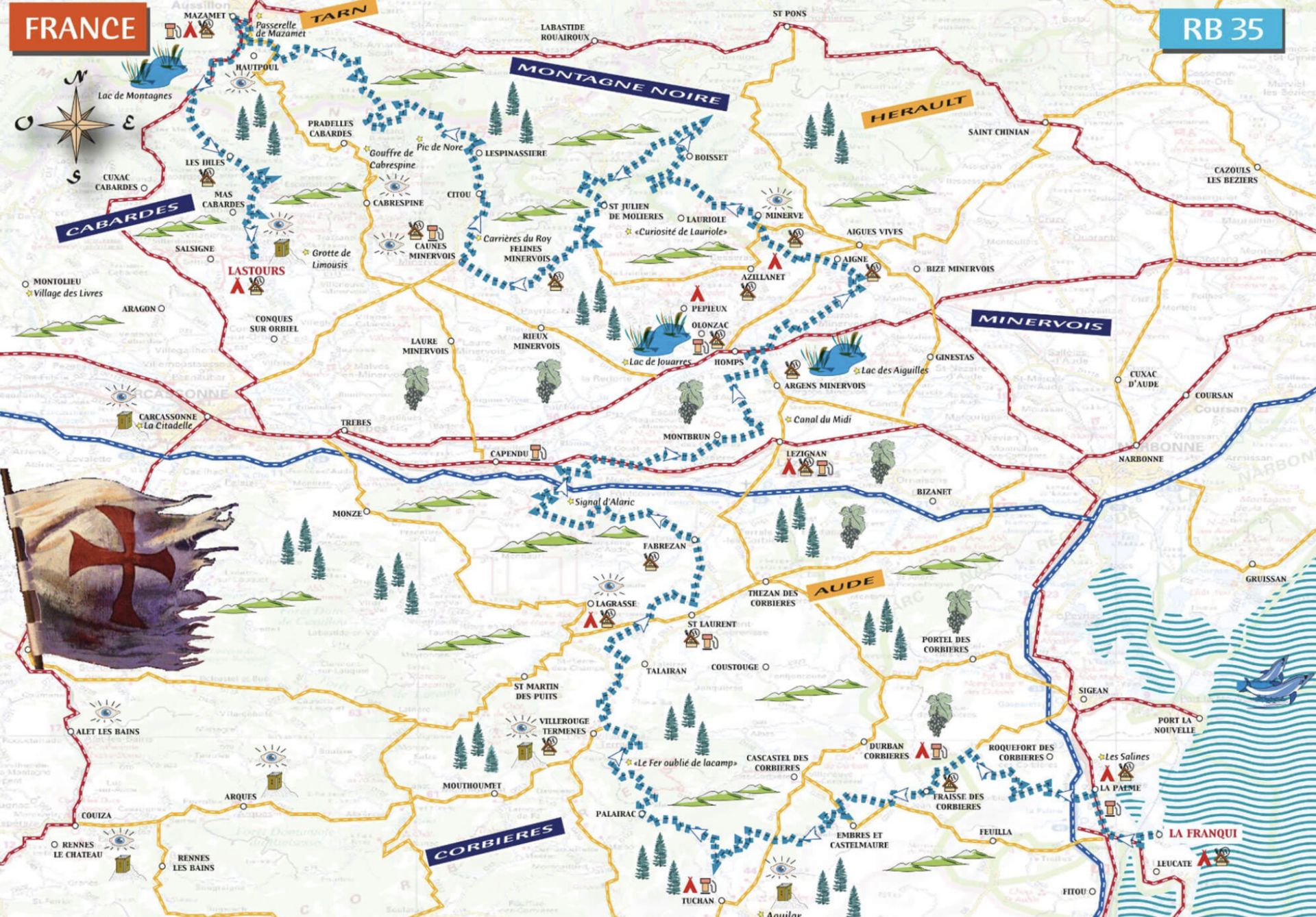 Ce road book vous conduira à nouveau dans les hauts lieux de l’histoire du Catharisme. Villerouge Termenes, Aguilar, Minerve, Hautpoul et pour finir en beauté les 4 Châteaux de Lastours! Les paysages se déroulent dans une agréable diversité. Méditerranée au départ, Corbières rocailleuses plantées de garrigues, belles pinèdes dans les montagnes d’Alaric, collines plantées de vignes dans le Minervois pour prendre une ambiance encore plus minérale en rejoignant la belle cité de Minerve. Le contraste est encore plus fort quand on pénètre dans les pistes forestières de la Montagne Noire. Le Pic de Nore offrira une vue somptueuse sur toute la région. Au cœur du Cabardes, les paysages depuis Hautpoul vers Lastours seront fait de hautes collines escarpées, jusqu’à celle où se dressent les 4 châteaux du village. Nous pourrions aussi l’appeler « La Route des Vins » tant nous serons en permanence au cœur des meilleurs vignobles d’Occitanie, caves et producteurs seront de belles haltes. Quant aux villages traversés, deux d’entre eux sont classés «Plus beau village de France» ou encore «De Caractère», mais nous affirmons volontiers qu’ils ont tous du charme et du caractère, tous un patrimoine particulier à découvrir et par dessus tout une ambiance méditerranéenne qui incite à la flânerie.