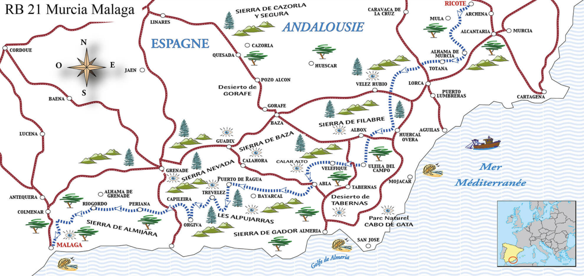 Cette traversée des Sierras andalouses vous surprendra par la diversité des paysages et des ambiances. Des massifs boisés aux roches déchiquetées aux environs de Murcia, nous traverserons des plaines arides en suivant des pistes le long de « ramblas », terme local pour désigner des fonds de canyons aux rios généralement asséchés. Bordés de lauriers roses, ponctués de quelques palmiers, nous aurons souvent l’impression d’être au Maroc.
